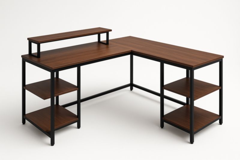 Scrivania angolare a L in MDF marrone con struttura in alluminio nero con mensole
