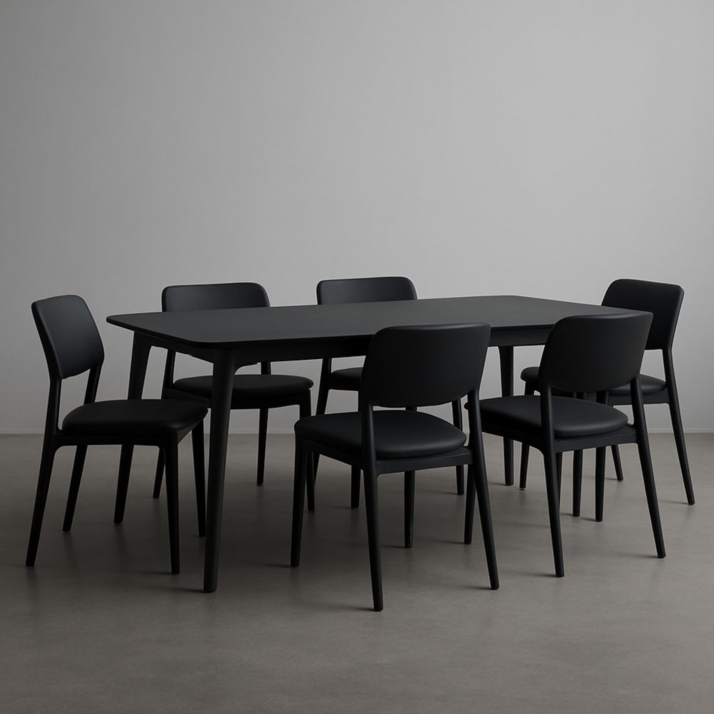 Set da pranzo rettangolare nero in legno con 6 sedie in poliuretano